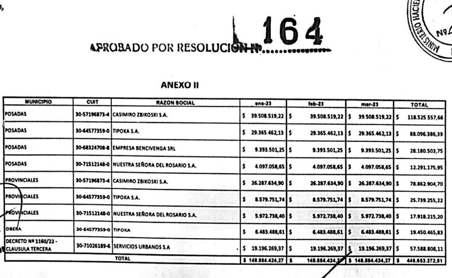 Junto con la resolución se publicó una planilla con los montos del reparto del primer trimestre: Casimiro Zbikoski se llevó $197 millones; Tipoka $133 millones; Nuestra Señora del Rosario $30,5 millones, Bencivenga $9,3 millones y Servicios Urbanos que no presta ningún servicio al usuario de transporte, no tiene colectivos y solo se encarga de administrar la tarjeta SUBE se queda con $57,5 millones.