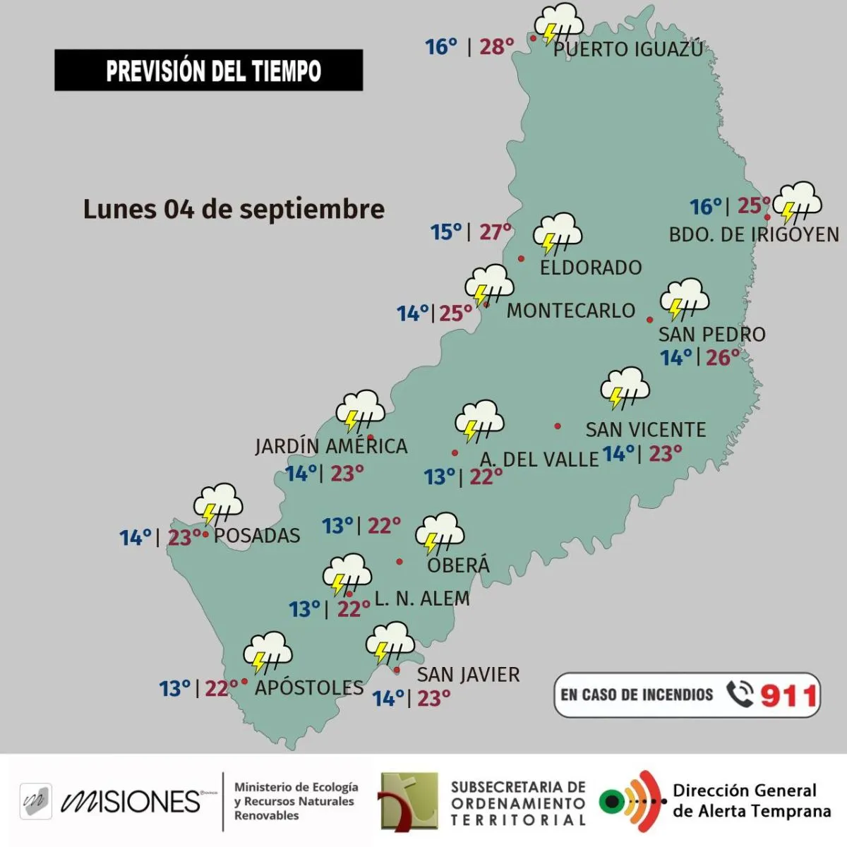 Según dieron a conocer desde el Sistema de Alerta Temprana de Misiones, para la jornada de este lunes, se esperan lluvias y tormentas para la jornada de este lunes, con periodos de precipitaciones intensas, descargas eléctricas y eventual caída de granizo.