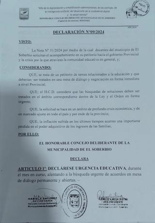 Los trabajadores de la educación de la localidad de El Soberbio tenemos el agrado de informar a la comunidad en general el logro colectivo que obtuvimos por parte del municipio. En la mañana de hoy el Honorable Concejo Deliberante en su declaración N°09/2024 expuso la Urgencia Educativa, alentando a la búsqueda urgente de acuerdos en mesa de diálogo permanentes por parte del Gobierno Provincial a los docentes que se manifiestan por un mejor salario.