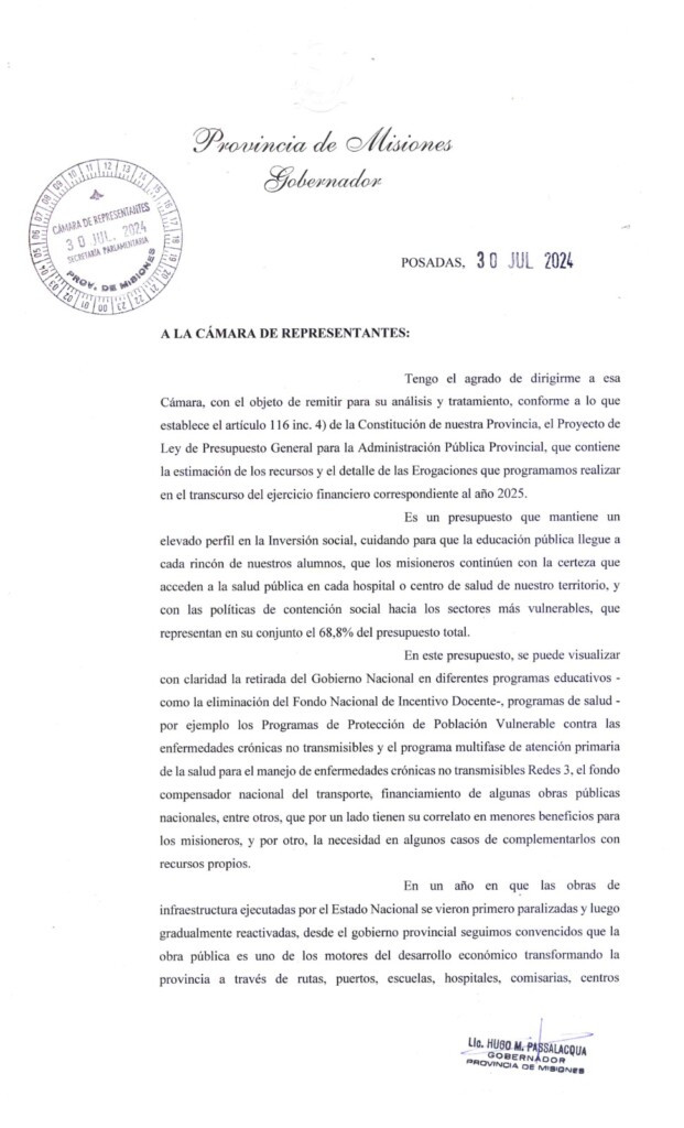El gobernador Hugo Passalacqua remitió en tiempo y forma el proyecto de presupuesto provincial para 2025 a la Legislatura de Misiones en la mañana de este martes.
