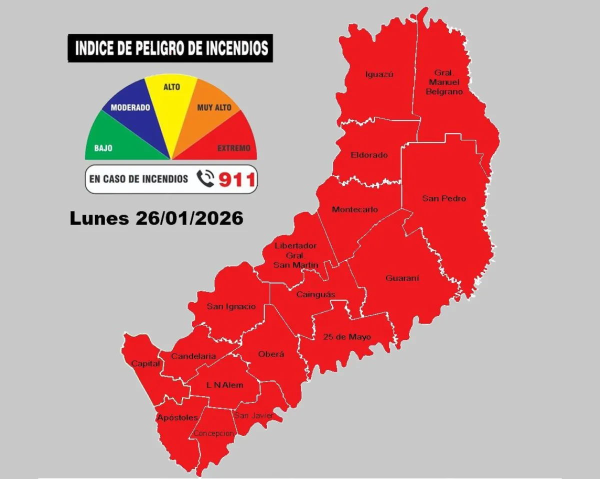 El calor de los últimos días y la falta de lluvia derivaron a que la provincia de Misiones se encuentre en "índice extremo de peligrosidad" por incendios, con todo el mapa en rojo según lo dio a conocer el Ministerio de Ecología. En los primeros 26 días de enero, se registraron 26 intervenciones por incendios de campos y pastizales.