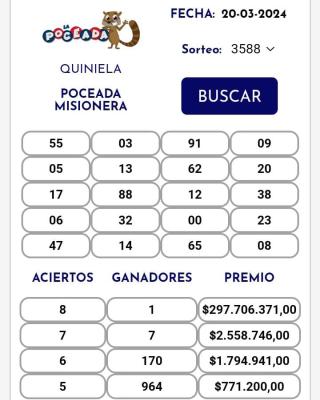 Los números del sorteo fueron 55, 05, 17, 06, 47, 03, 13, 88, 32, 14, 91, 62, 12, 00, 65, 09, 20, 38, 23 y 08. Resta saber cuáles fueron los elegidos por el ganador que se quedó con el pozo de 297.706.371 pesos, el más alto desde la reedición del juego, en agosto de 2017.